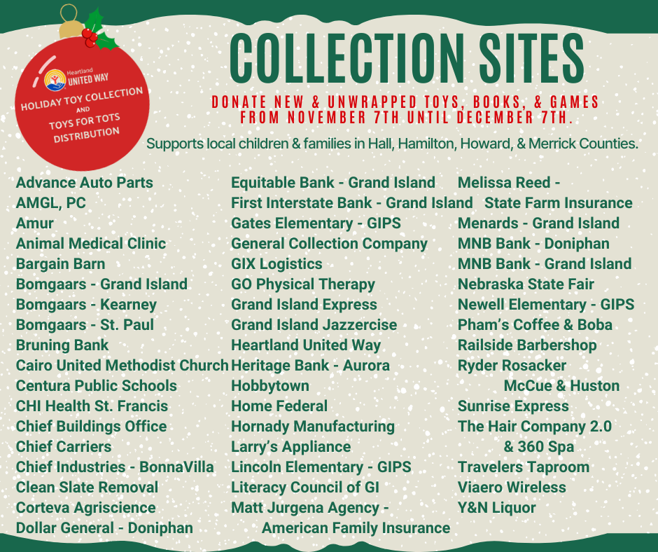 Donations of new, unwrapped toys and gently-used books are collected starting in November 2025. Please drop off donations of new, un-wrapped toys at the Heartland United Way office (1441 N Webb Road, Grand Island).