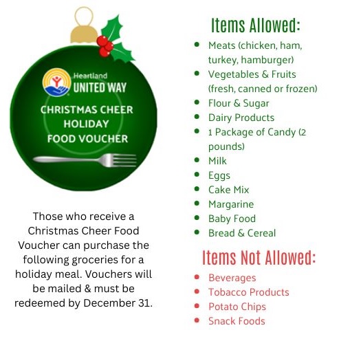 Christmas Cheer was established in 1910 to provide a helping hand to local families during the holidays. A volunteer board operated this program, and in 2024 the Heartland United Way started to carry on this tradition. This program provides a grocery voucher for a holiday meal to people in need in Hall County.
